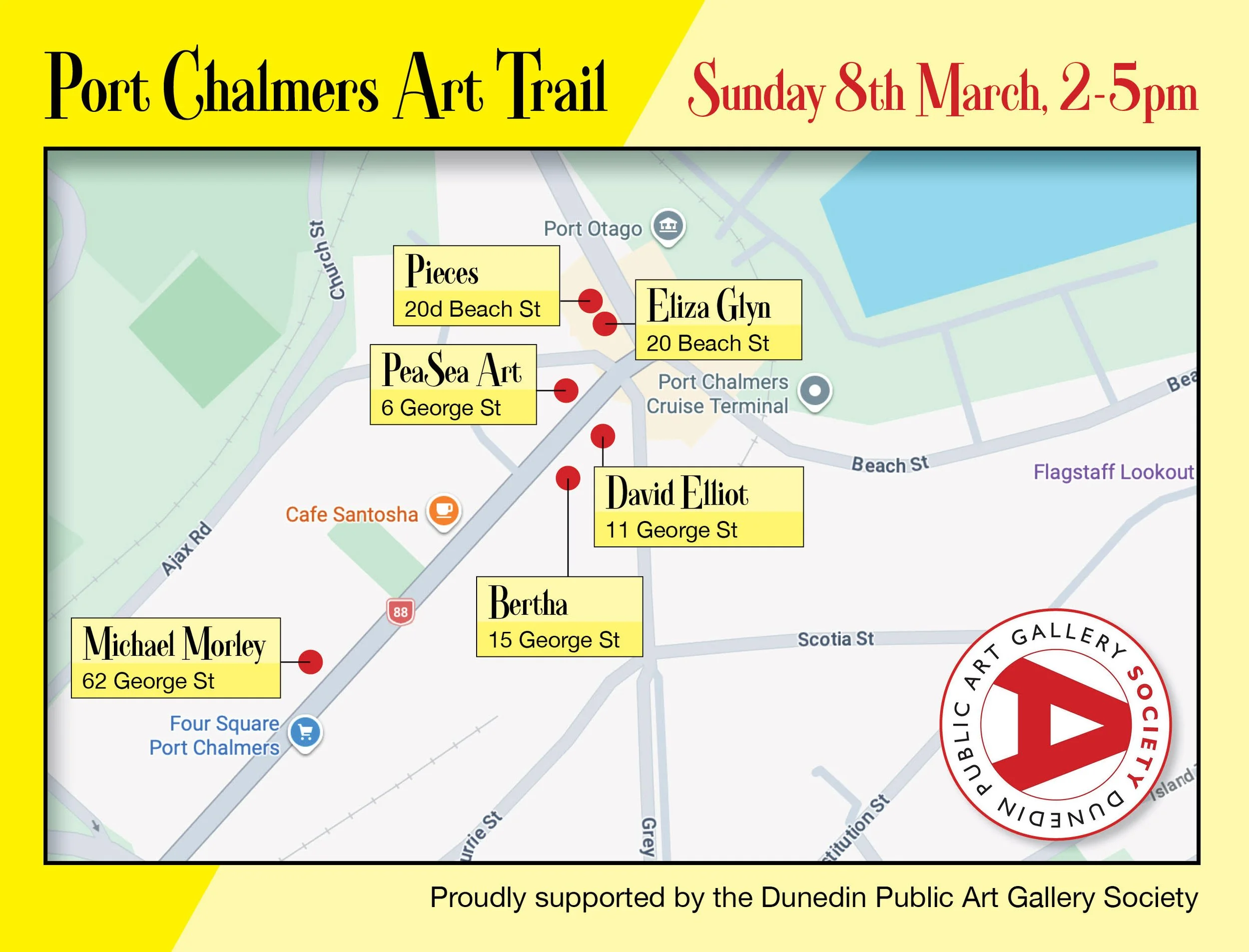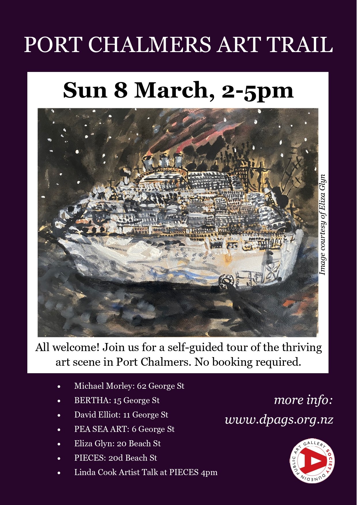 We suggest beginning the trail at PeaSea Art at 2pm, although feel free to meander your way anytime between 2 - 4.30pm. This is an independent wander through the studios and galleries of Port Chalmers organised by DPAGS. Map is viewable here.